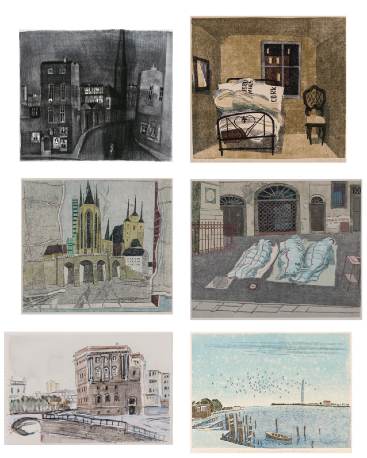 Arbeiten von Robert Förch von links oben: Die Schwarze Kathedrale – Dublin, Lithografie 1959; Das Bett des Torfstechers, Linolschnitt 1958; Erfurt – Ein Fensterbild, Linolschnitt 1992/94; Drei Schläfer auf der Piazza, Linolschnitt 1990; Berlin – Am Kupfergraben, Zeichnung mit Gouache 1990; Vogelschwarm über der Lagune, Linolschnitt, 2008